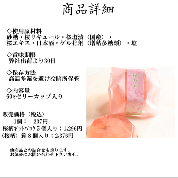 原材料名 砂糖、桜リキュール、桜塩漬(国産)、 桜エキス、日本酒、ゲル化剤(増粘多糖類)、塩
